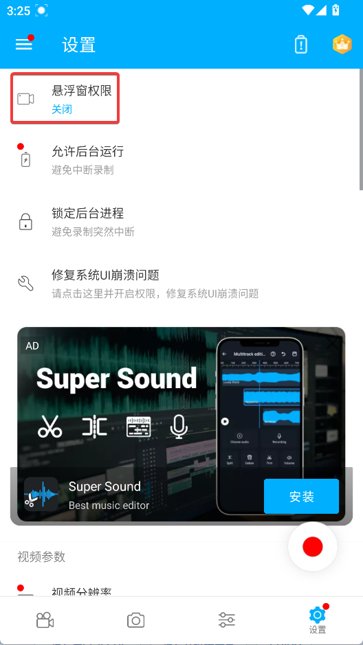 1、打开超级截图录屏大师app,点击右下角“设置”