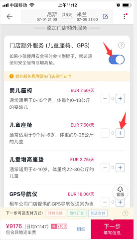 3、 在搜索页面选择喜欢的套餐,进入套餐详情页,查看车辆和套餐详情、条款等。如需额外购买保险或选择门店额外服务,可分别点击“添加”或“+”数量。