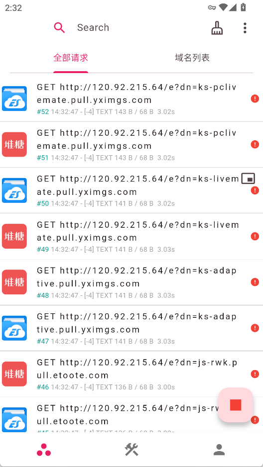 3、之后就能看到手机里发生的所有网络请求了,可以通过关键词搜索,
