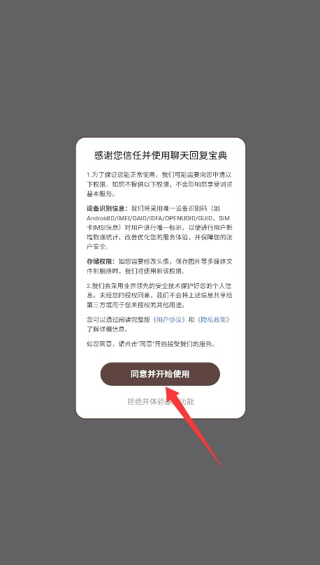1、初次使用需完整阅读平台服务条款与隐私政策,确认后点击同意并开始使用。