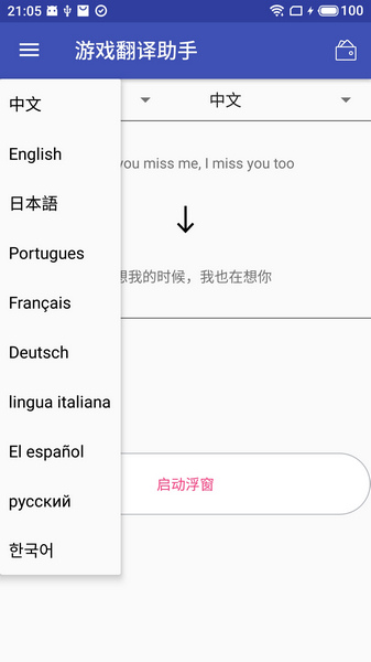 4、接着返回应用,选择要翻译的语种,并启动浮窗;