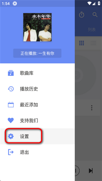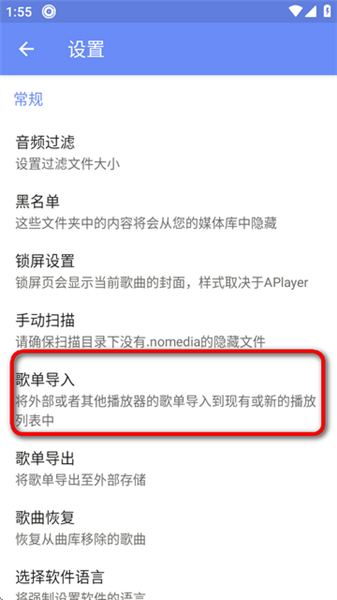 2、进入设置页面,选择歌单导入。