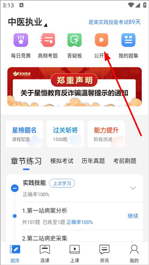 1、打开星题库,登录进入首页,可在首页进行考试项目练习,点击公开课;