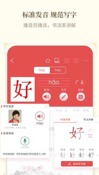 3、它还具有两大特色功能,一是提供了动态和静态两种标准笔顺,并支持屏幕跟写,用户可识别、掌握3500个基础汉字的笔画;二是由专业播音员对1万余个汉字进行播读,用户也可以点击“朗读”键测试自己普通话的准确性。