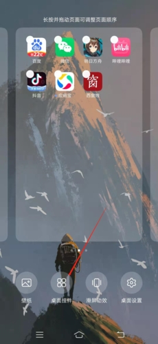 4、长按手机主界面空白处,在弹出的设置界面中找到下方的 “桌面挂件”。
