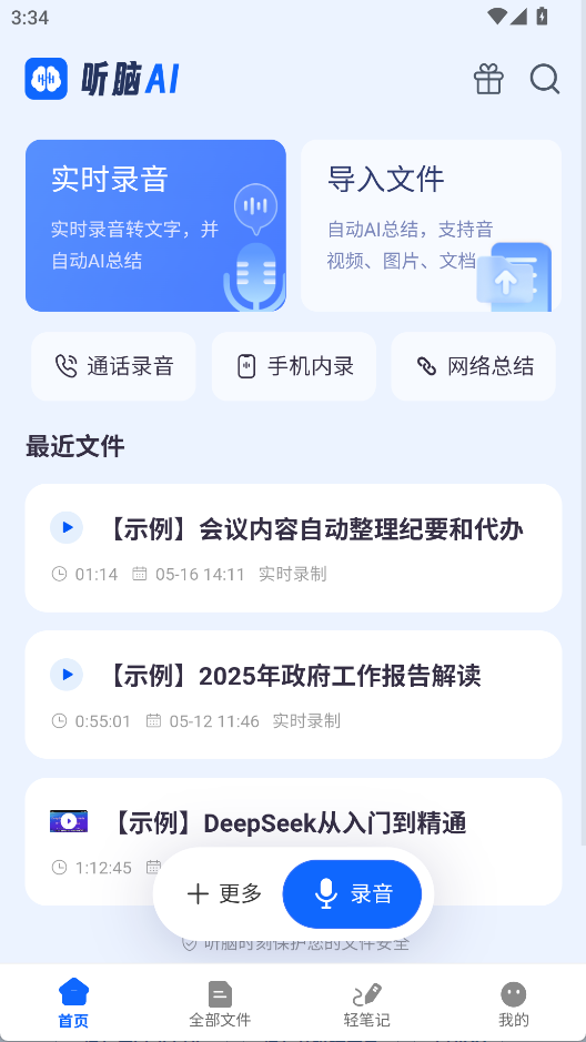 1、进入首页可以看到实时录音、导入文件等功能,最近文件列表里显示了最近录制的音频