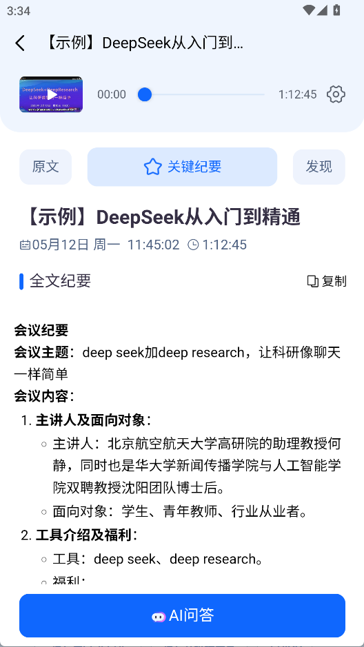 2、智能总结:自动生成会议纪要和摘要,提取待办事项,提升整理效率。
