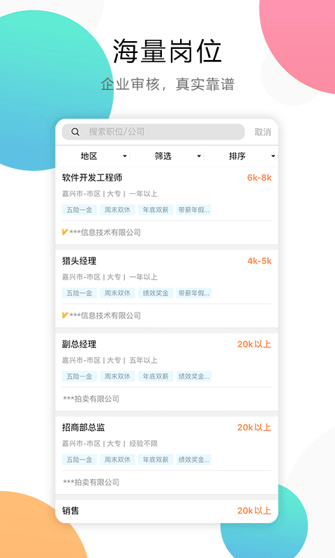 2、企业级真实发布,其中所有发布的职位都经过认证,保证公平公正。