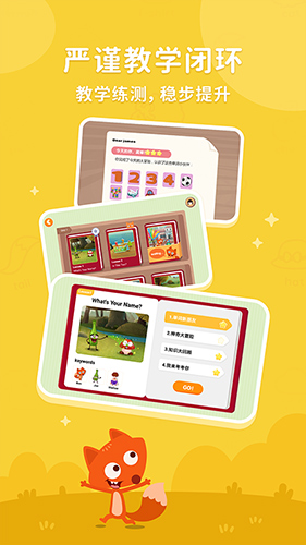小狐狸英语app围绕核心课程,我们为孩子打造每节课的一系列学习任务, 通过教、学、练、测、评完整教学流程,真正实现科学高效英语启蒙,让孩子牢牢的掌握英语。