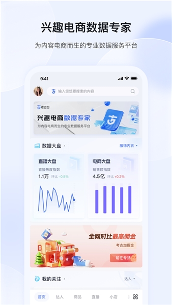 《考古加app》是一款由杭州合聚变信息技术有限公司研发制作的针对短视频直播带货数据分析的平台软件。热销榜单、优质达人、商品数据等信息一目了然。基于行业领先的数据处理能力秉承“ 考古家 ”精神 ,挖掘内容电商数据价值,兴趣电商数据专家,随时查找和监控达人、直播、商品数据。所以你们现在如果想要成为更加厉害的人,那么在这里就可以帮助你们来实现啦!