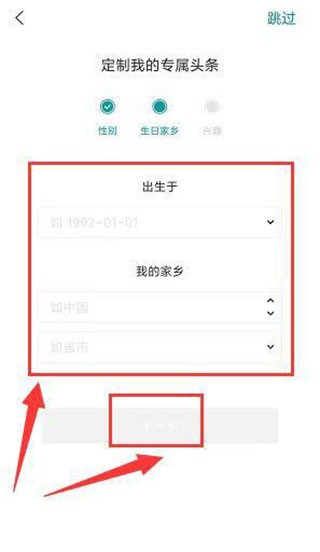 5、进入生日家乡设置页,选择“出生于”和“我的家乡”信息,单击下一步。