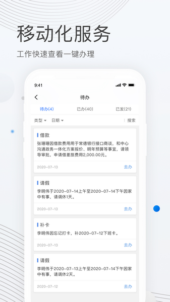 3、提供一站式移动数字化办公功能,日志、签到、申请、审批、请假等都有;