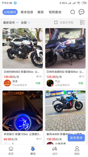 4、在借车板块可以选择接摩托或者电动,同时还可以在此发布信息。