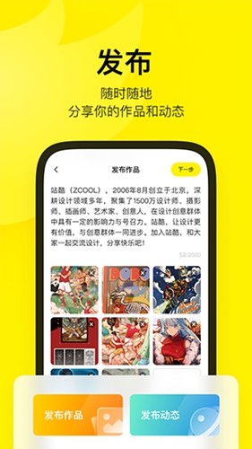 与站酷官网同步更新首页展示的高质量设计\创意内容,实时查看好友动态如:发布新作、推荐以及评论。