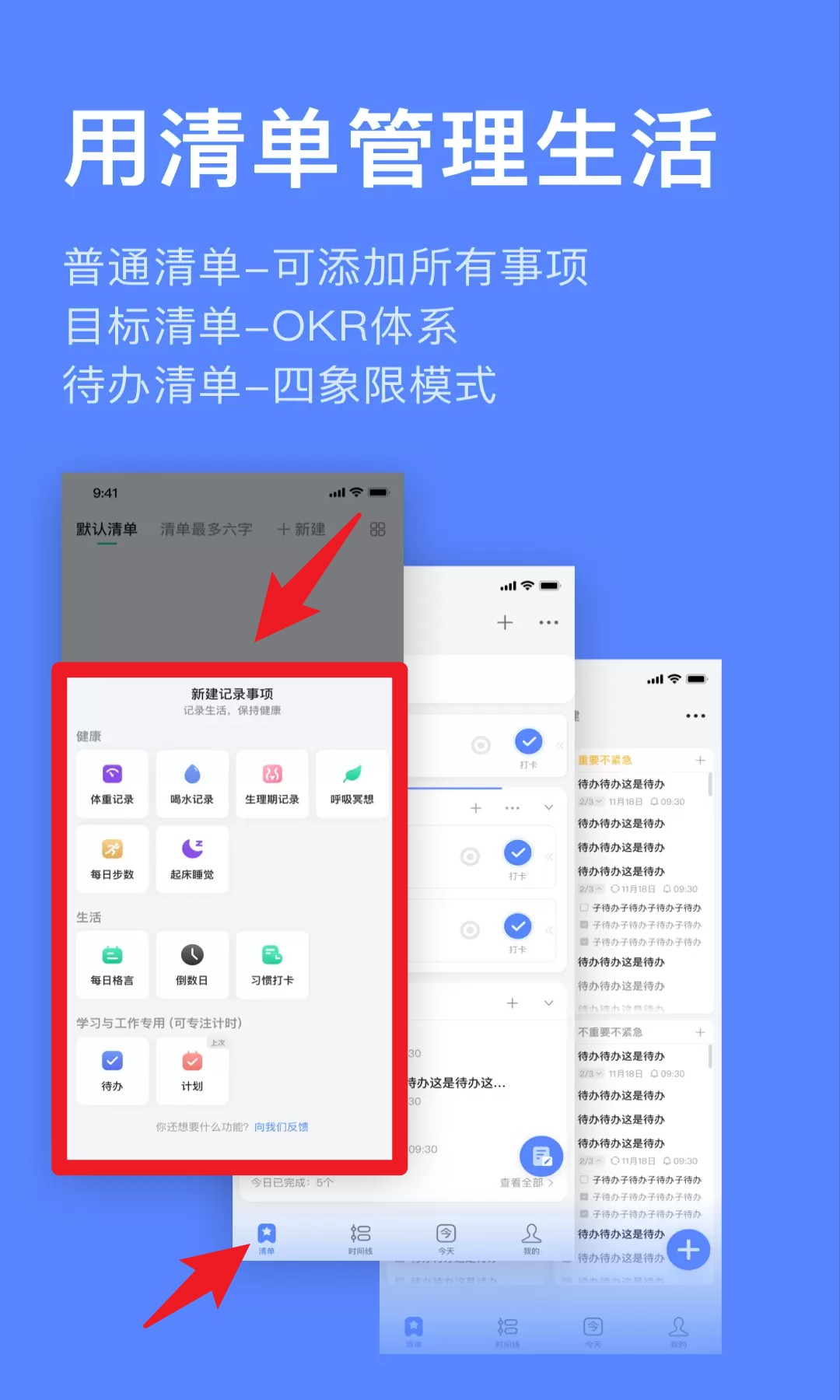 3. 登录成功后,在清单页面点击右上角新建按钮,选择要记录的清单类型,如饮水、体重、倒数日等。