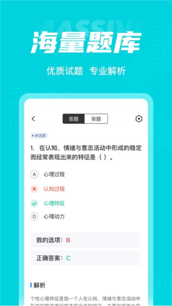 心理咨询师考试聚题库app提供丰富的历年真题和全真模拟,专业团队打造权威解析。用户可以随时随地离线下载试卷,不受网络限制。应用还提供个人专属题库错题集功能,记录用户所有做错题目并收藏重要题目,有助于巩固知识点。