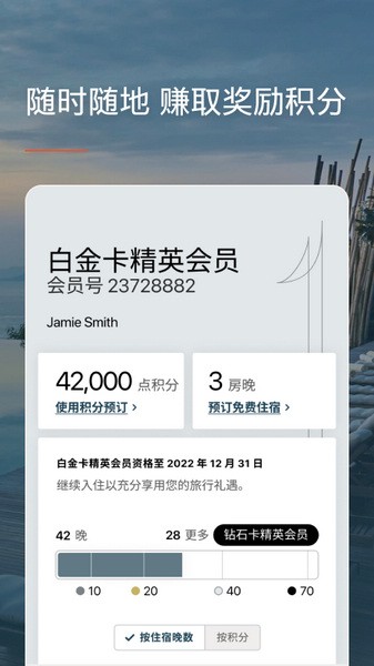 全新的外观、全新的会员体验,方便追踪积分和礼遇,同时快速预订。点击。预订。旅行。