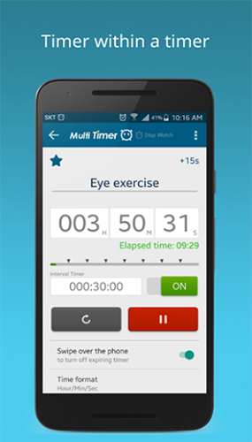 间隔计时器:将多个计时器拼接组成一个功能强大的计时器。该计时器会在每个计时器开始的时候发出警报,并在计时完成的时候,自动开始下一个计时器。该计时器时候锻炼的时候使用。