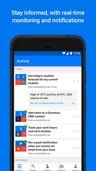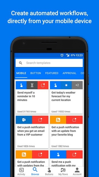 PowerAutomate是一款专为提升用户的工作效率的app,你可以在这里创建任意数量的工作流,并将手机上的各个功能和操作进行随意的组合,使其能够自动完成一系列的操作。同时你还可以为这些任务设定不同的触发条件来对应不同的使用场景。另外编辑好的工作流也可以随时启动或关闭,且支持分组,管理起来还是很方便的。