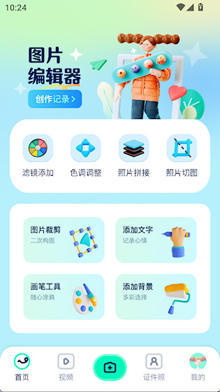 3、灵活图片编辑:支持裁剪、拼图、调色、加文字和更换背景等操作,自由组合创作个性化图片。