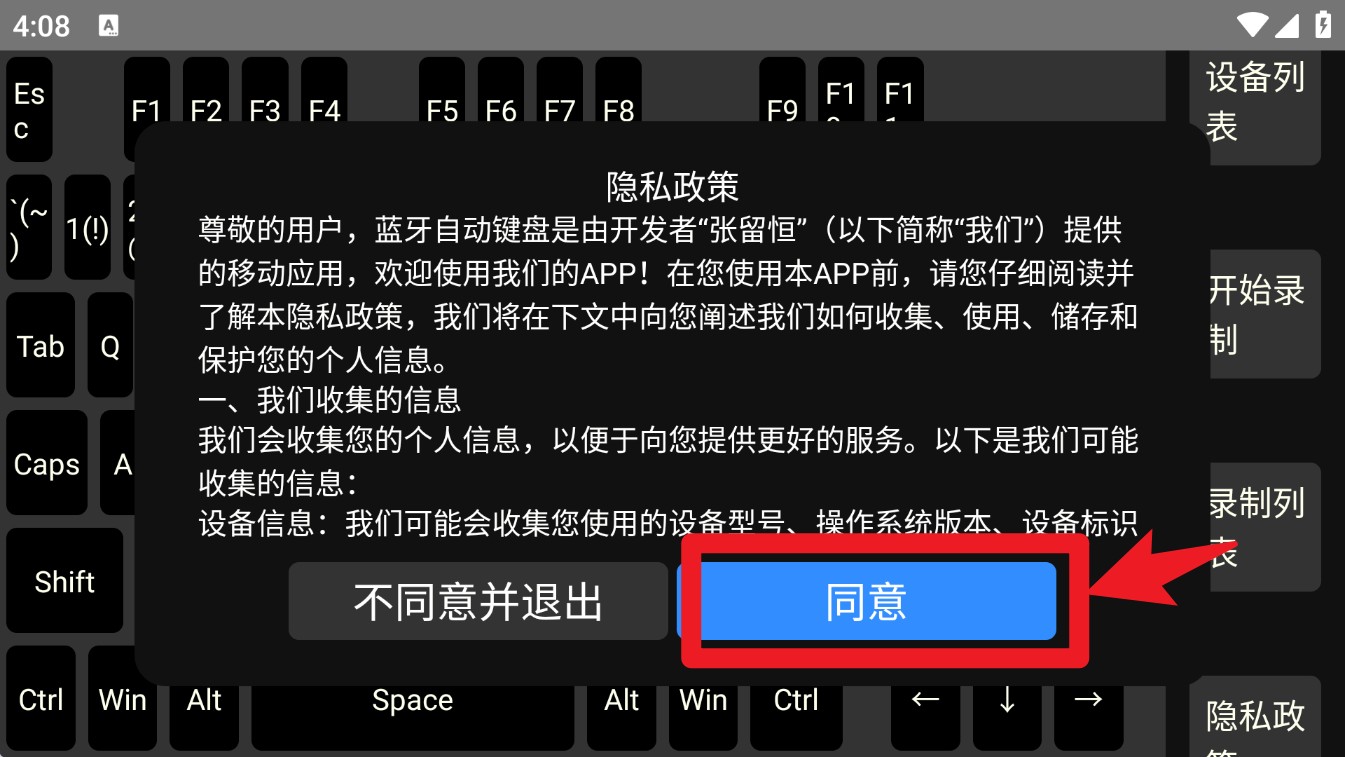 1. 打开App后会先弹出隐私政策提示,点击同意继续进入主界面。需确认授权设备权限以确保连接与操控正常。