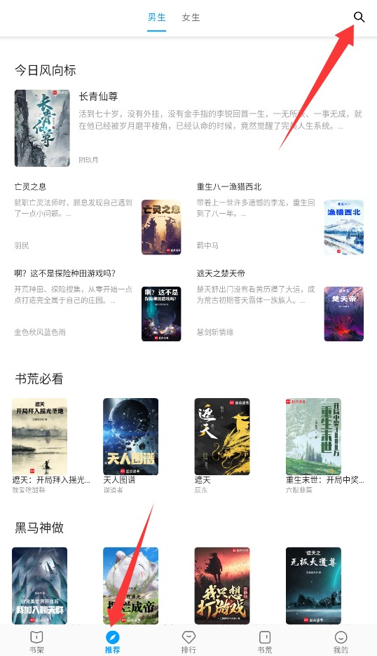1、打开APP之后,先进入推荐页面,点击顶部右侧的搜索图标,输入你想看的小说名称进行查找。