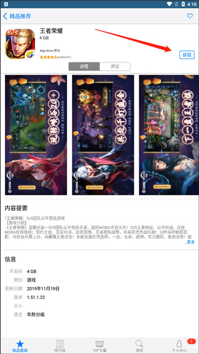 2、登录成功后,界面将显示精品推荐、排行榜、VIP专属、搜索、个人中心五大板块,找到心仪游戏点击进入详情。