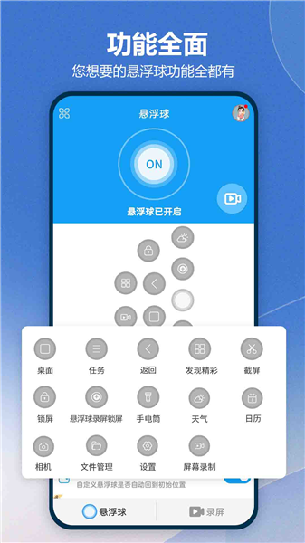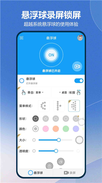 1、悬浮锁屏创新性的悬浮球长按操作,可以定义为桌面或者锁屏,更加快捷地实现基本操作。