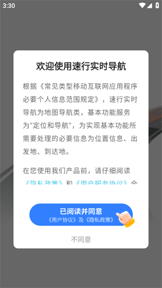 1、首次打开速行实时导航app,阅读隐私政策与用户服务协议,确认后点击“已阅读并同意”。
