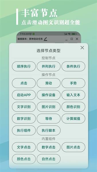 -可视化脚本精灵:首创行为树流程控制,内置20+操作节点(点击/输入/图文识别/变量控制),轻松搭建自动抢单、循环任务