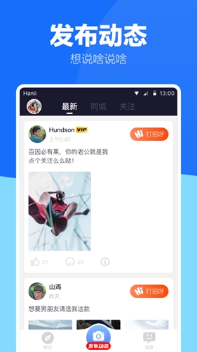 1、基于地理位置推荐身边用户,支持“打招呼”发起互动。
