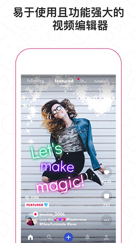 Funimate是一款视频编辑处理应用,融合了超过多先进视频特效、表情符号和贴纸等元素,能够自由地裁剪、合并与编辑视频,提供丰富的素材库,包含数千种设计元素、滤镜和背景选项,帮助用户创作出炫酷的音乐视频、对口型视频或慢动作视频。