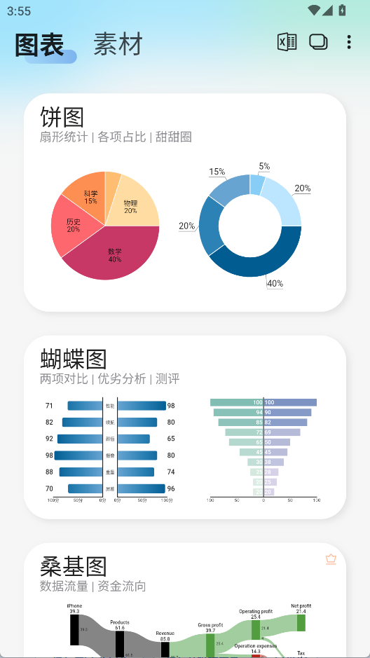 覆盖饼图、雷达图、折线、柱状、散点、漏斗、蝴蝶、桑基等十余种专业图表,一键切换即可生成高清图片,满足商业、学术、个人多场景需求。