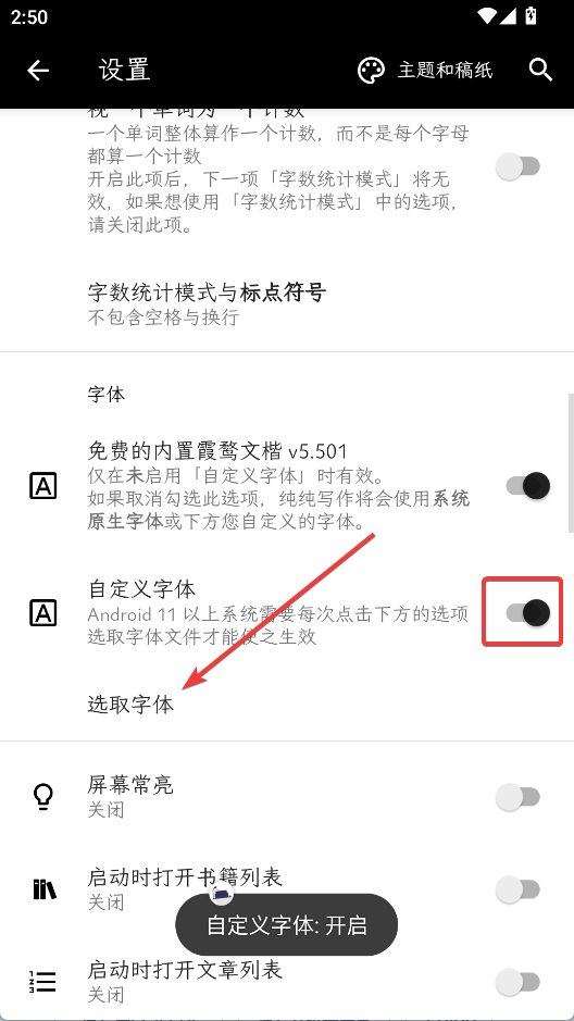 3、进入设置界面后开启自定义字体选项,点击选择字体,选择手机里的字体文件即可