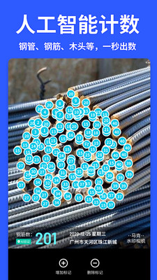 马克水印相机增加了AI智能水印,可以拍照清点人数,拍照数钢筋,拍照智能识别车牌等等。