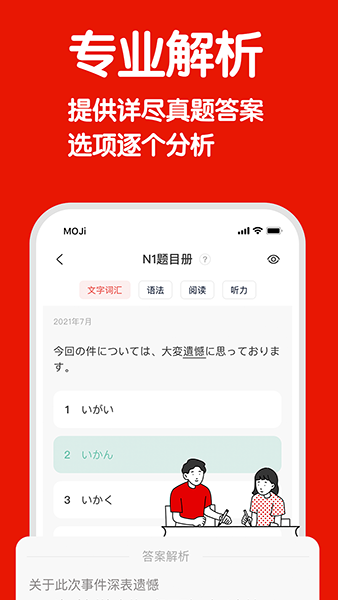 1、MOJiTest这里教学的日语有专门的课程、中文讲解、视频、影音等,让你可以先培养学习兴趣,再潜移默化的学习。