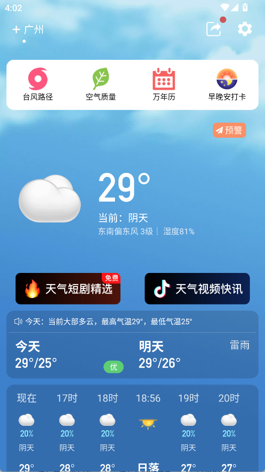 1、进入主界面能看到当前天气、温度、逐小时预报等信息,下滑查看更多内容