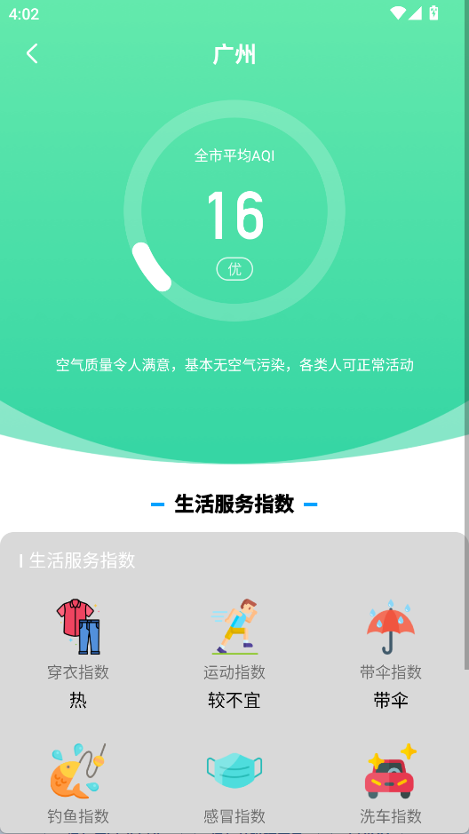 2、点击空气质量查看全市平均AQI和生活指数