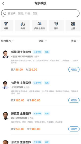 2、聚合全国多家三甲医院的专业医师资源,可按科室、疾病或医生姓名进行检索和预约问诊。