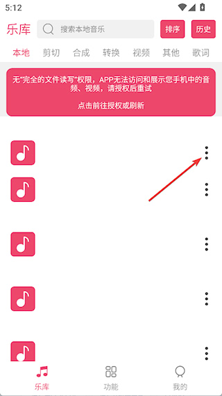 1、打开app授予文件读写权限,点击音频文件右侧的三点按钮