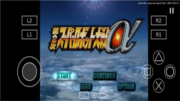 这里我选择了眼镜厂的第二次机战Alpha汉化版,横屏进入游戏默认下方是按键区域,由于我手头没有拉伸手柄,所以没法测试对手柄支持如何。这里要提的一点是,下方方块和 start 键中间按钮是摇杆/十字键切换。