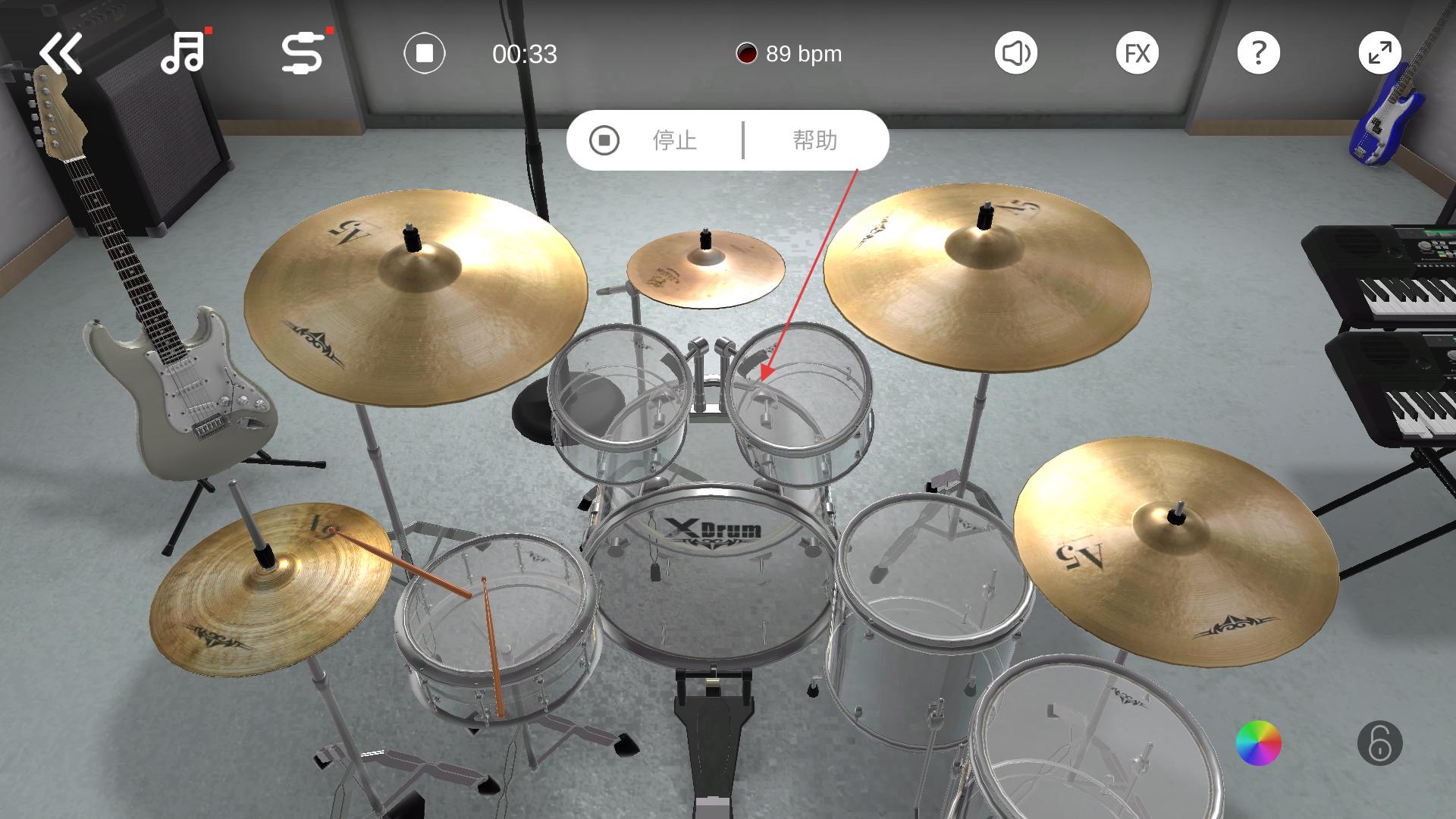 2、进入演奏界面后,可通过直观的虚拟鼓组进行实时操控,兼容吉他等多种乐器伴奏,灵活调节节奏快慢与强度,享受沉浸式演奏带来的乐趣与成就感。