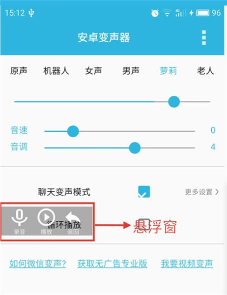 3、点击悬浮窗播放按钮,会先倒计时两秒再播放变声后的声音,倒计时至1时按住微信录音键。