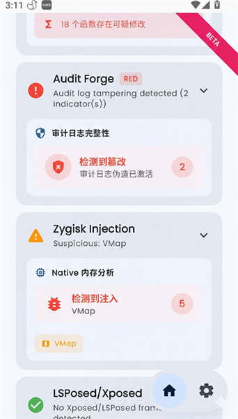 提供详尽的检测项清单(全绿或报红),方便玩家针对性地调整 Shamiko 或隐藏应用列表等插件配置,是极致搞机玩家追求“环境全绿”的必备跑分工具。