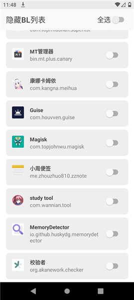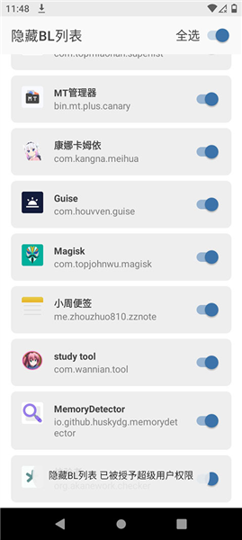 支持为单款 / 多款应用独立设置 BL 隐藏策略,可按需勾选目标应用,自定义伪装范围,操作灵活。