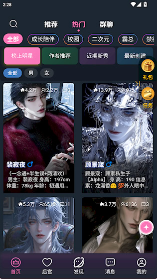 4、 多样化角色创建:用户可以自主创建AI角色,支持丰富的人设选择,包括狼系奶狗、霸道总裁、病娇忠犬等多种性格类型。