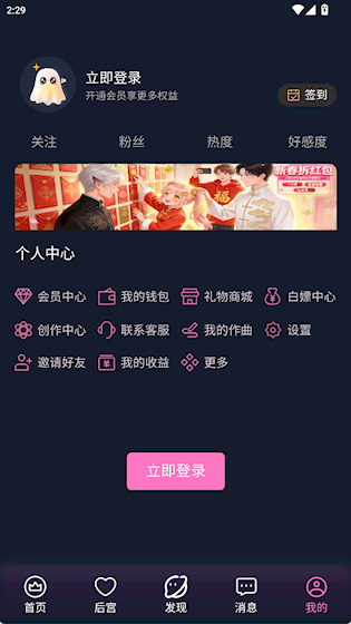3、进入“我的”界面进行登录、签到、查看个人信息