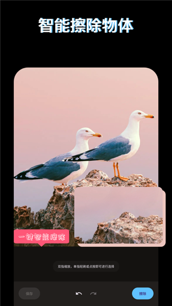 2、魔术擦除:运用智能AI擦除技术,轻松去除照片中的瑕疵和不需要的物体,让你的照片更加完美。