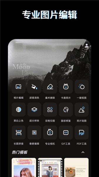 1、滤镜调色:拥有海量精美的滤镜,一键打造各种风格的照片,从复古怀旧到冷峻酷炫,总有一款适合你。