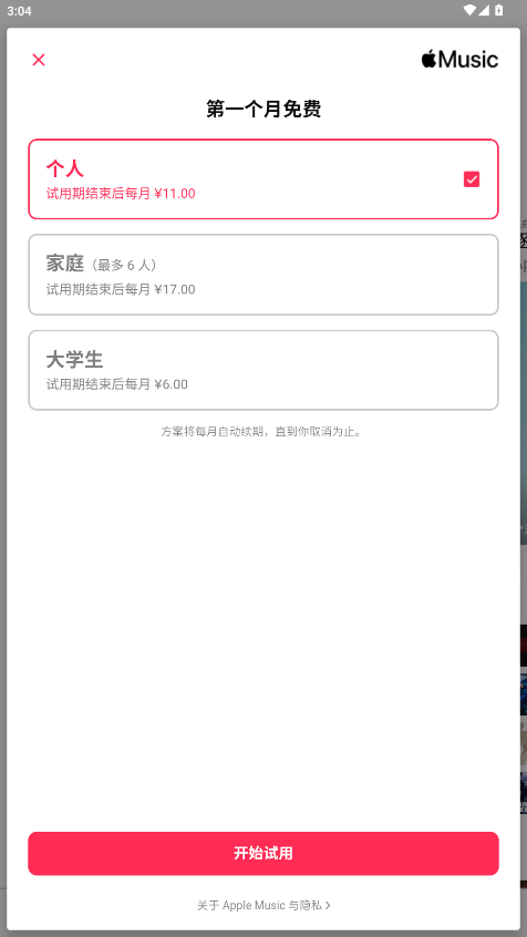 4、根据需求选取个人订阅、最多六人共享的家庭订阅,或学生订阅。